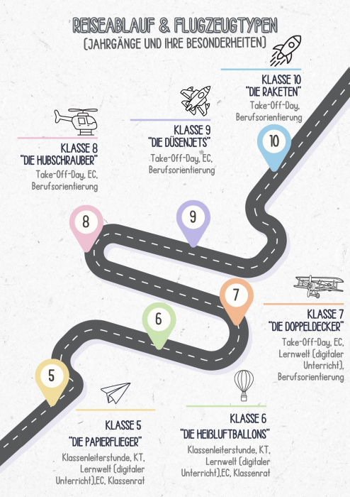 Im Rahmen unseres Flughafenkonzepts haben wir unseren Klassen die Namen verschiedener Flugzeugtypen gegeben. So spiegelt sich auch hier unser Leitgedanke wider. Denn Flugzeuge stehen für Aufbruch, Entdeckung und das Überwinden von Grenzen – Werte, die wir auch im Schulalltag leben möchten. Mit den Namen möchten wir Neugier, Teamgeist und die Freude am gemeinsamen Lernen fördern. Jede Klasse kann sich so mit ihrem eigenen Flugzeugtyp identifizieren und gemeinsam „abheben“!